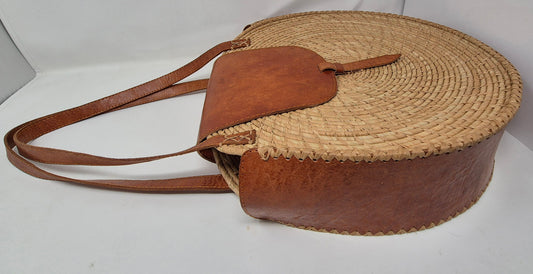 Handgefertigte Runde Raffia & Leder Tasche mittelgroß