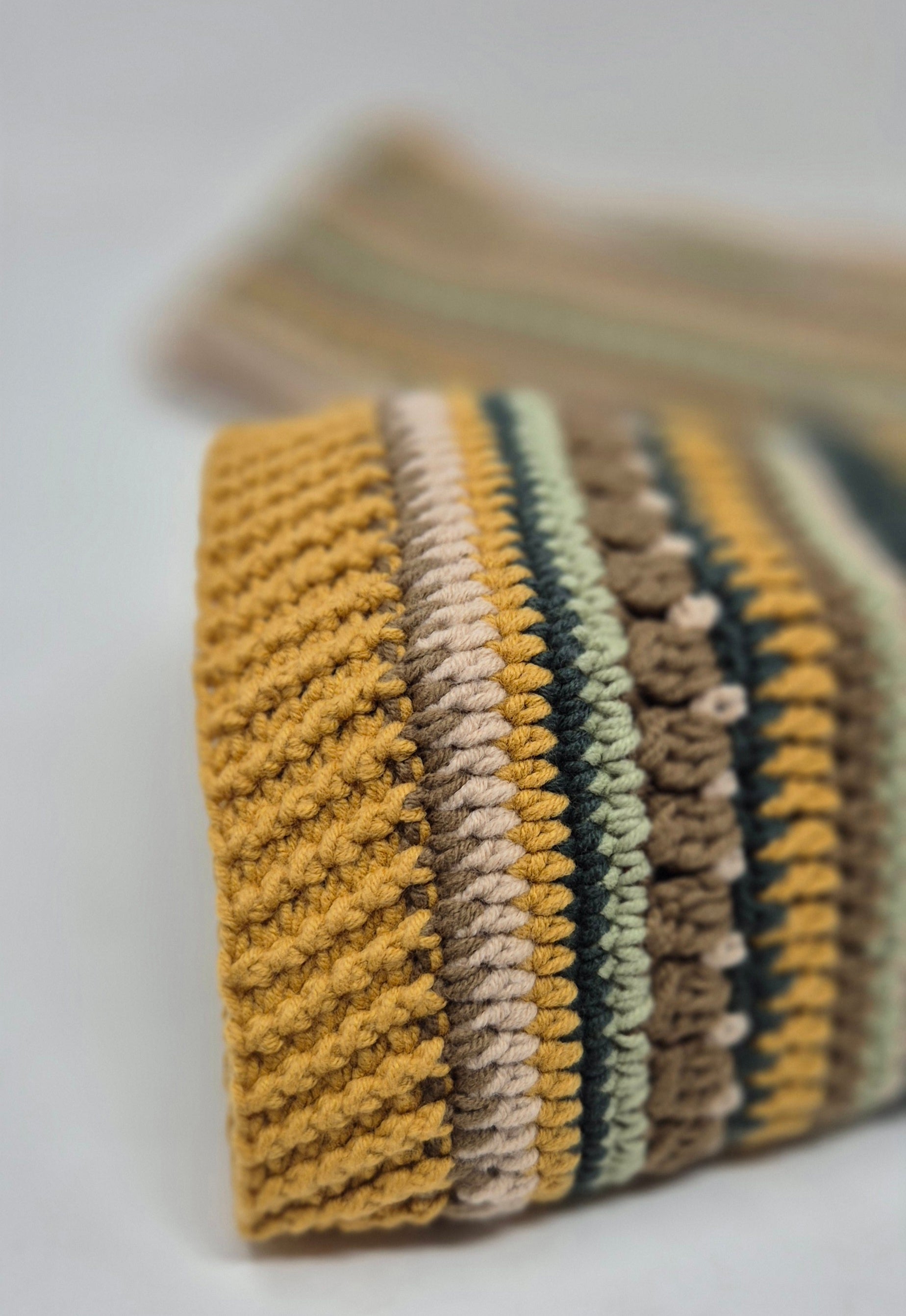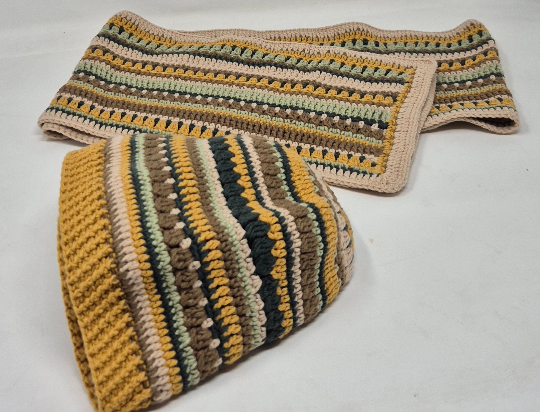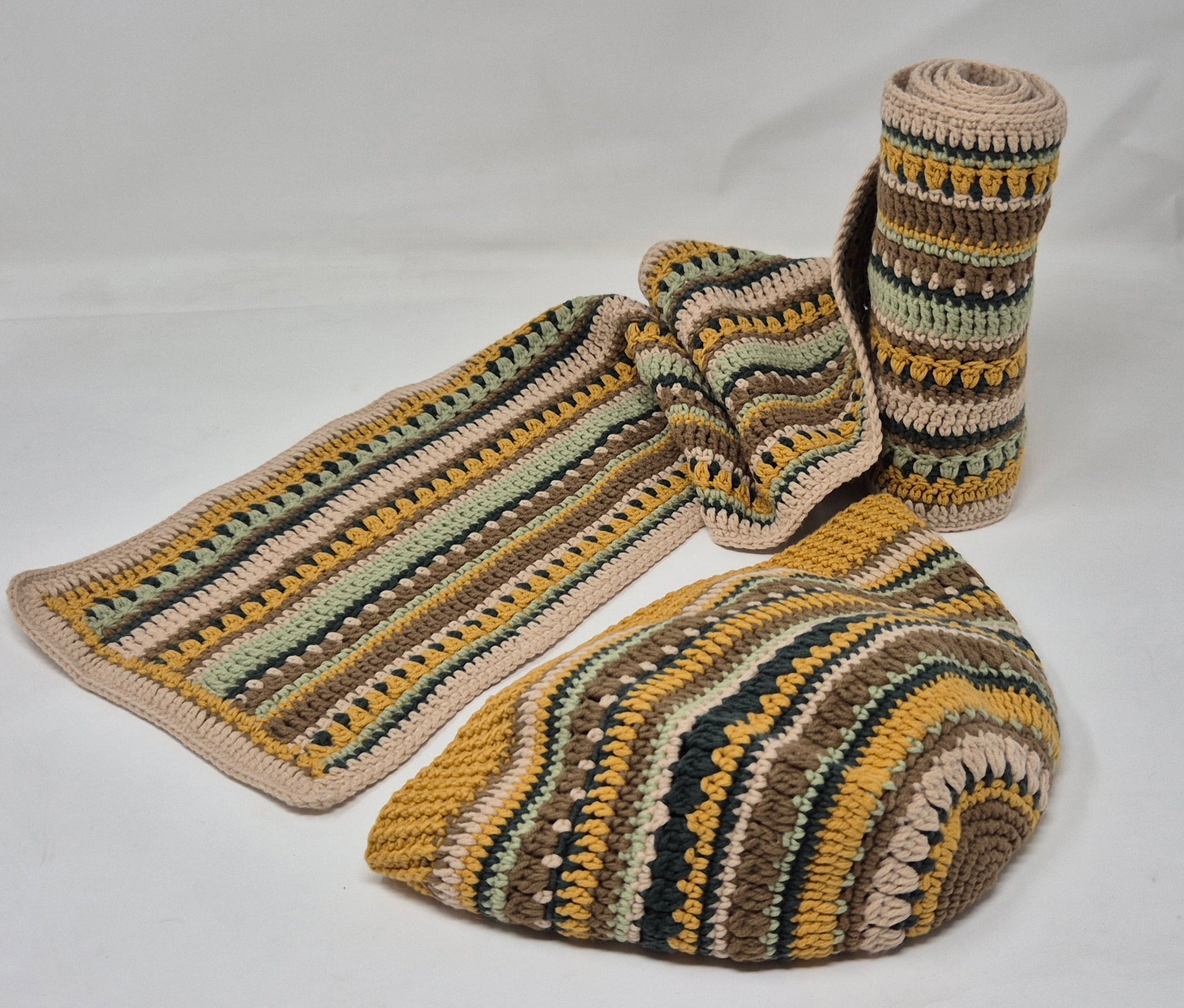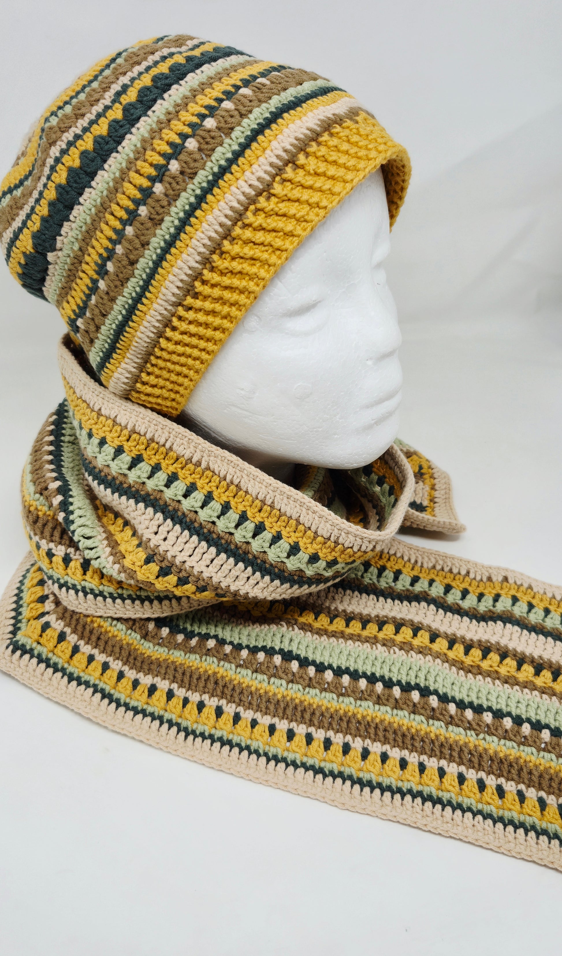 Ein liebevoll handgehäkeltes Set aus Mütze & Schal im warmen Naturfarbverlauf – inspiriert von Herbstwald, Moos, Sand und Senfgelb. Weich, angenehm auf der Haut, nicht kratzend und ideal für kühle Tage.