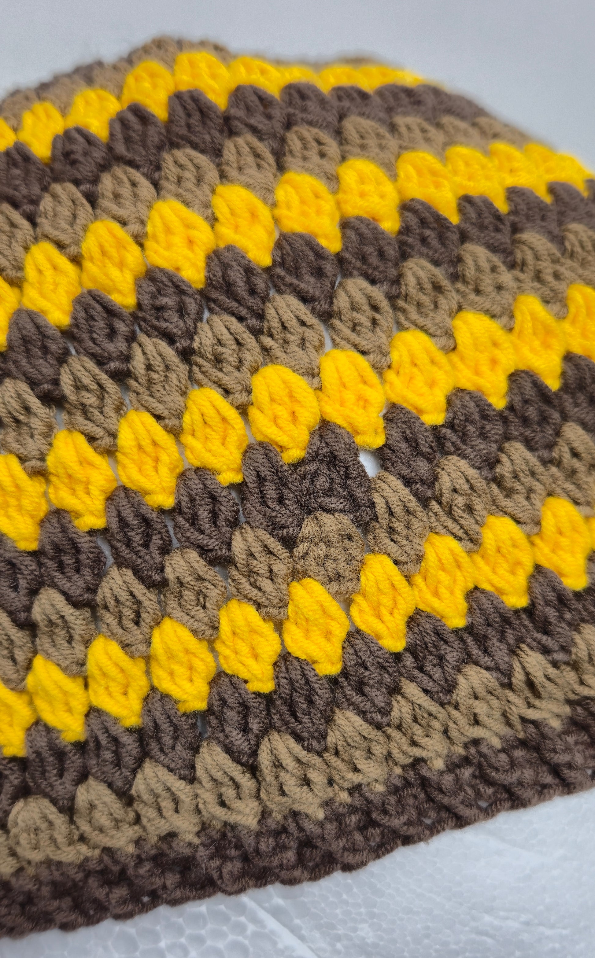 Warme Erdtöne kombiniert mit sonnigem Gelb schaffen einen einzigartigen Vintage-Boho-Look. Jedes Stück ist sorgfältig per Hand gefertigt – ein echtes Einzelstück, ideal für kalte Tage, Herbstspaziergänge oder als besonderes Geschenk.