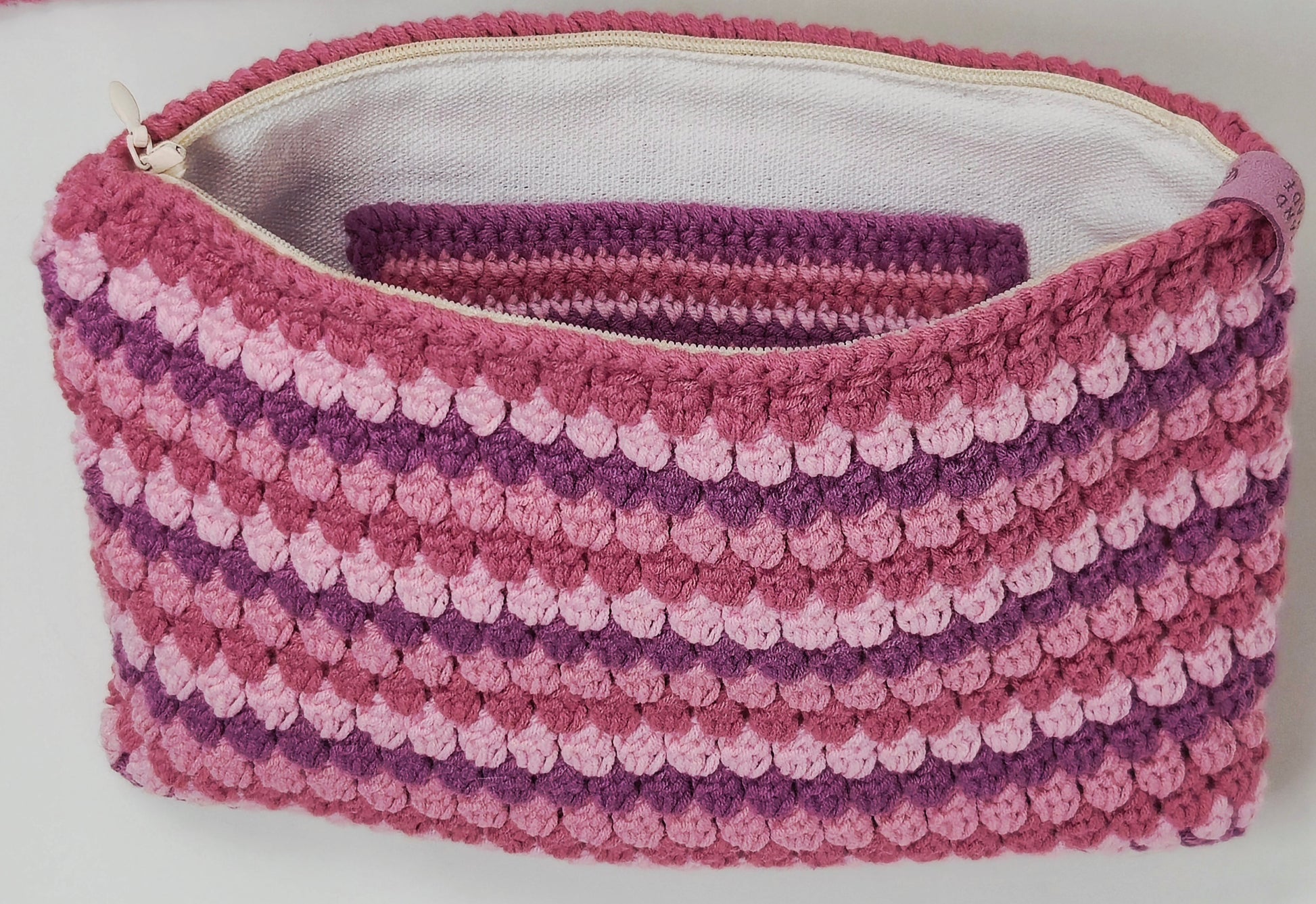 Diese liebevoll gehäkelte Kosmetiktasche wurde mit viel Zeit, Geduld und Präzision hergestellt. Die Bubble-Stitch Struktur sorgt für einen außergewöhnlichen 3D-Effekt und macht die Tasche stabil und weich zugleich.