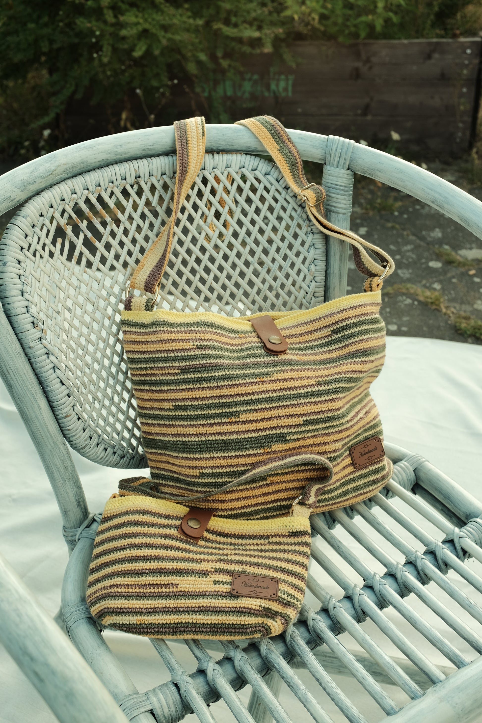 Das perfekte Taschen-Set für Mama und Kind - handgefertigt mit Liebe aus hochwertigem Garn (50% Wolle, 50% Acryl). Die größere Tasche bietet ausreichen Platz für die Essentials der Mama, während die kleinere Tasche perfekt für das Kid ist, um Spielsachen oder kleine Schätze zu verstauen.