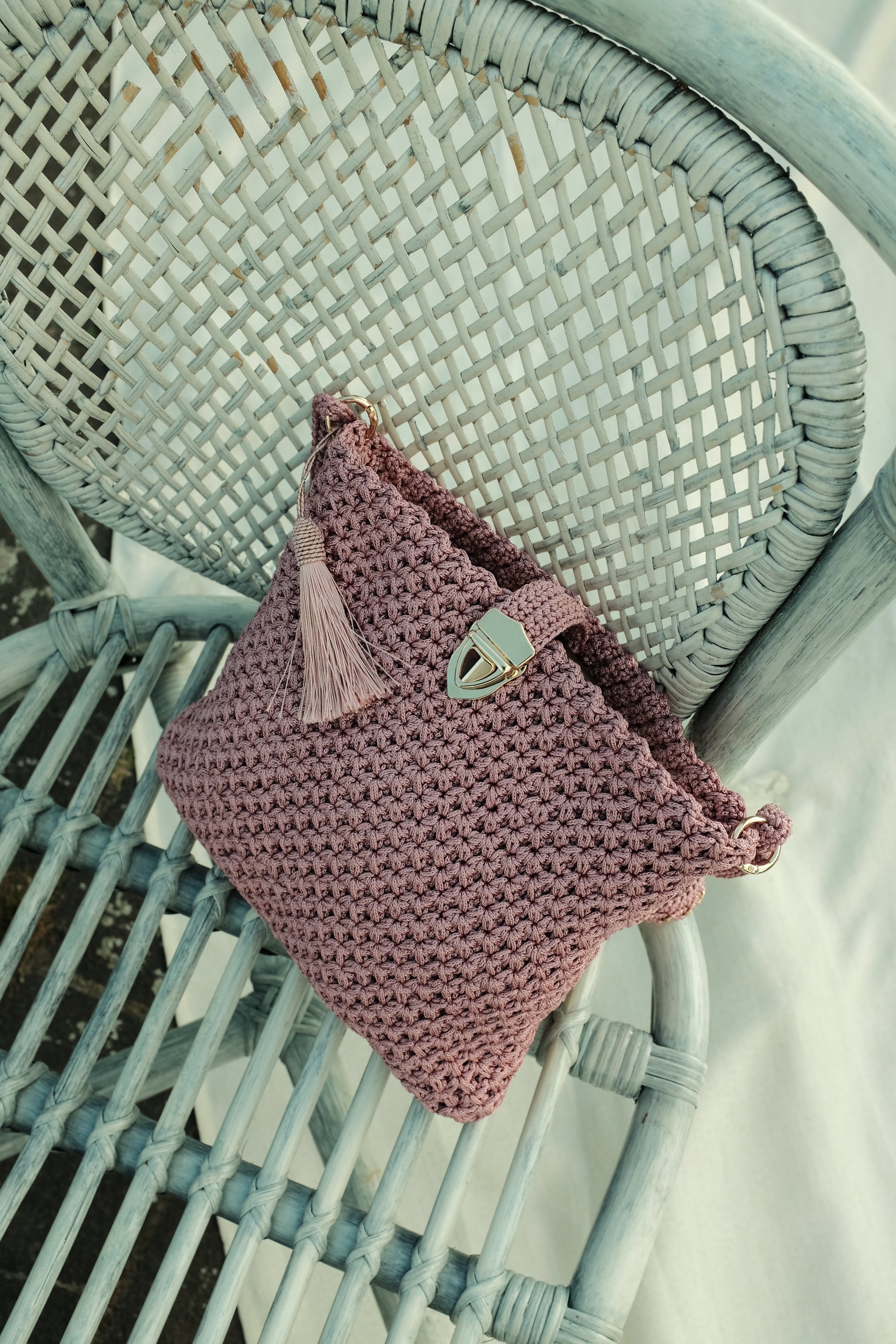 Diese stilvolle Tasche wurde liebevoll aus hochwertigem Makramee-Garn in einem eleganten Rosègold-Ton gefertigt. die feine Häkelarbeit verleiht der Tasche eine außergewöhnliche Textur, während die goldfarbene Kette und der dekorative Troddel für einen Hauch von Glamour sorgen.